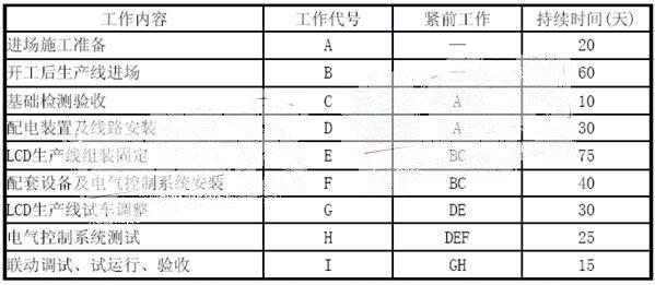 2006(二)南方電子電氣有限公司(建設單位)新建液晶屏(LCD)生產車間,其生產線由建設單位從國外訂購,A 施工單位承包安裝。A 施工單位進場時,生產車間的土建工程和機電配套工程(B 施工單位承建)已基本完工。A 施工單位按合同工期要求,與建設單位、生產線供應商和B施工單位洽談,編制了LCD 生產線安裝網絡計劃工作的邏輯關系及工作持續時間表(見下表)。LCD 生產線安裝網絡計劃工作邏輯關系及持續時間表