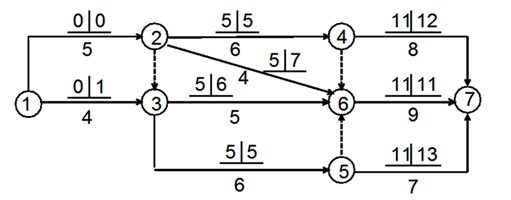 A.確定關鍵線路:1-2-3-5-6-7,1-2-4-6-7。T=20B.工作總時差=最遲開始時間-最早開始時間;C.工作4-7最早完成時間為11+8=19,工作5-7的最早完成時間為11+7=18;自由時差=計劃工期(20)-最早完成時間,20-18≠20-19,兩項工作自由時差不相等。D.工作2-6的總時差=7-5=2;自由時差=11-(5+4)=2,因此相等。E.工作3-6的總時差與自由時差相等。故選A,B,D。