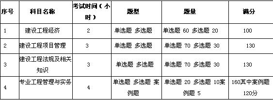 一級建造師執業資格考試設《建設工程經濟》、《建設工程項目管理》、《建設工程法規及相關知識》、《專業工程管理與實務》這4個科目。其中《專業工程管理與實務》科目設置10個專業類別:建筑工程、公路工程、鐵路工程、民航機場工程、港口與航道工程、水利水電工程、市政公用工程、通信與廣電工程、礦業工程、機電工程。