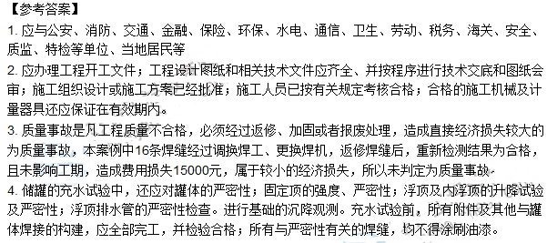 儲罐建造完畢,施工單位編制了充水試驗(yàn)方案,檢查罐底的嚴(yán)密性,罐體的強(qiáng)度、穩(wěn)定性。監(jiān)理工程師認(rèn)為檢查項(xiàng)目有遺漏,要求補(bǔ)充。