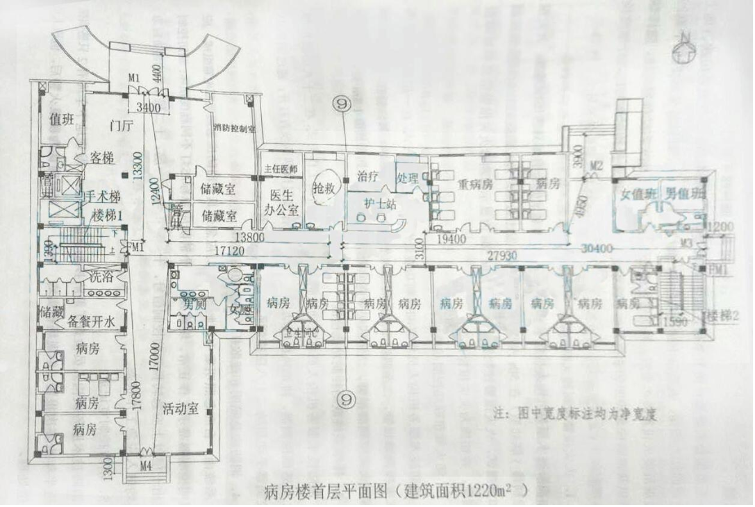 該病房樓六層以下各層建筑面積均為1220㎡,圖中⑨號軸線東側地下室建筑面積為560㎡,布置設備用房。中間走道北側自西向東依次布置消防水泵房、通風空調機房、排煙機房,中間