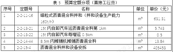 經批準的路面施工方案為:瀝青混凝土由工廠集中廠拌(不考慮瀝青拌和廠設備安裝拆除費、場地平整、碾壓及地面墊層等費用),8t自卸汽車運輸,平均運距3.8km,攤鋪機分兩幅攤鋪,預算定額分項(直接工程費)見表5。