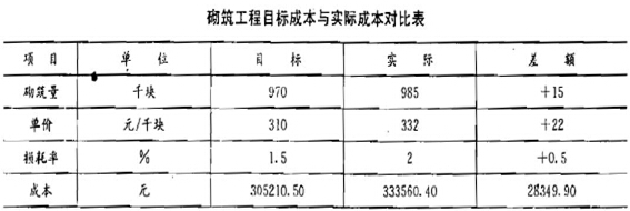 事件四:該項(xiàng)目的 GZL 保溫砌塊砌筑工程目標(biāo)成本為 305210.50 元,實(shí)際成本為 333560.40 元,比目標(biāo)成本超支了 28349.90 元,施工單位運(yùn)用成本分析的基本方法對 GZL 保溫砌塊砌筑工程施工成本進(jìn)行分析:采用因素分析法,分析砌筑量、單價(jià)、損耗率等因素的變動(dòng)對實(shí)際成本的影響程度,有關(guān)對比數(shù)據(jù)見下表。
