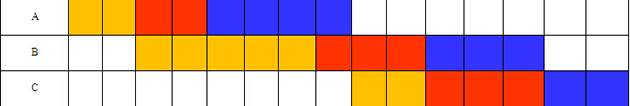 事件一:項目部為組織流水施工,在平面上劃分為三個施工段,三個施工過程:基礎(chǔ)、主體結(jié)構(gòu)、二次砌筑,三個施工過程采用三個作業(yè)隊組織無節(jié)奏流水施工,其流水施工橫道圖如圖所示(時間單位:月)。