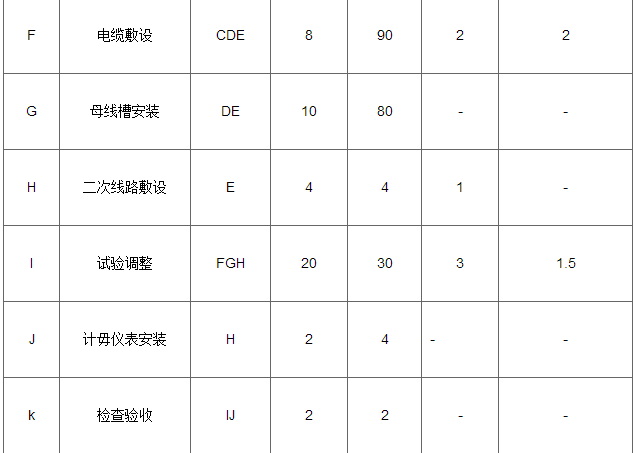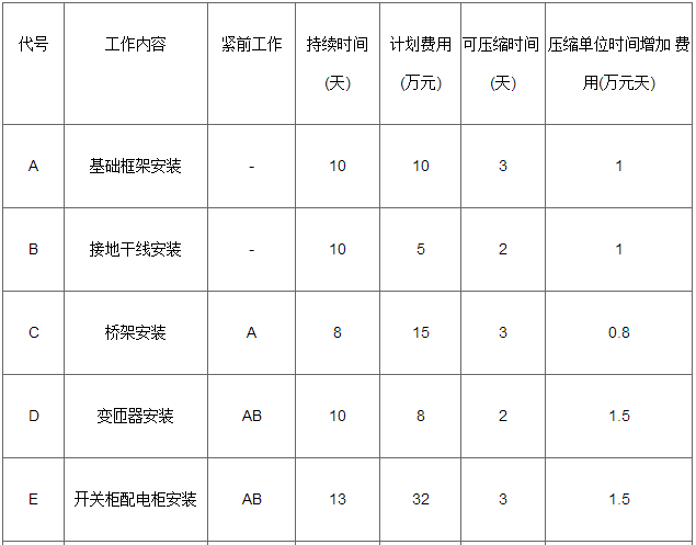 安裝公司項目部進場后,依據合同、施工圖、驗收規范及總承包的進度計劃,編制了變配電工程的施工方案、進度計劃、勞動力計劃和計劃費用。項目部施工準備工作用去了5天。當正式施工時,因商場需提前送電,業主要求變配電工程提前5天竣工。項目部按工作持續時間及計劃費用(見下表)分析,在關鍵工作上,以最小的趕工增加費用,在試驗調整工作前趕出5天。