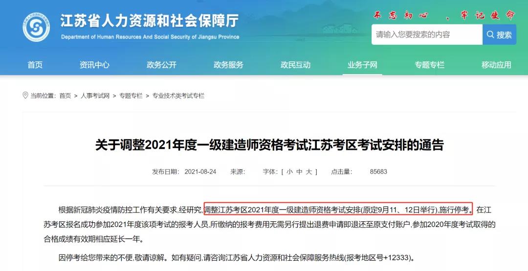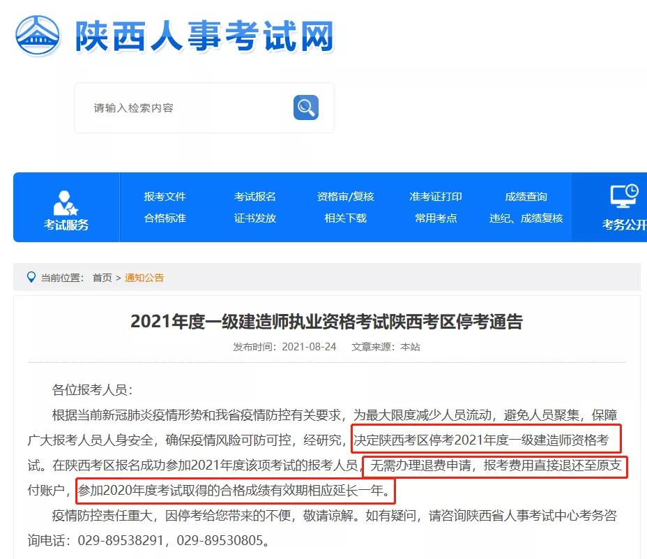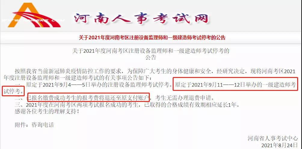 重磅消息!河南人事考試網、陜西人事考試網和江蘇省人社廳今日發布通告,河南、陜西、江蘇三地2021年一級建造師考試停考,報考費用直接退還,2020年考試取得合格成績有效期延長一年。以下是通告原文。