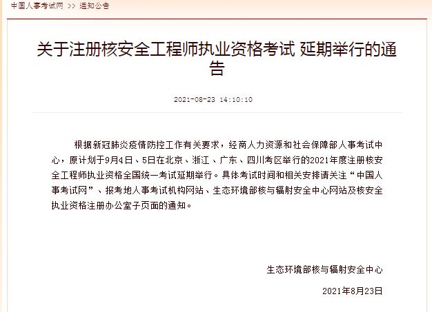 根據新冠肺炎疫情防控工作有關要求,經商人力資源和社會保障部人事考試中心,原計劃于9月4日、5日在北京、浙江、廣東、四川考區舉行的2021年度注冊核安全工程師執業資格全國統一考試延期舉行。具體考試時間和相關安排請關注“中國人事考試網”、報考地人事考試機構網站、生態環境部核與輻射安全中心網站及核安全執業資格注冊辦公室子頁面的通知。