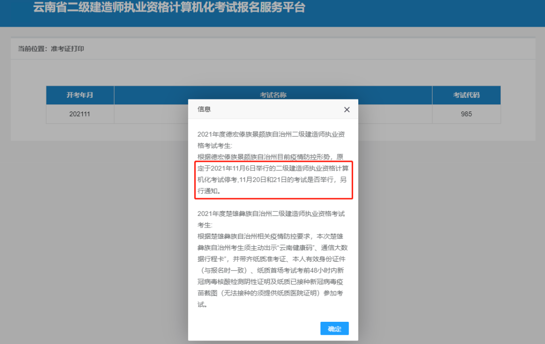 云南省2021年第一批二級(jí)建造師考試時(shí)間為11月6日,目前準(zhǔn)考證正在打印中,考生可以登錄報(bào)名系統(tǒng)模擬考試系統(tǒng)進(jìn)行練習(xí)。