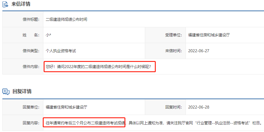 福建省住房和城鄉建設廳:往年通常約考后三個月公布二級建造師考試成績,具體以網上通知為準,請關注我廳官網“行業管理--執業注冊--資格考試”欄目。