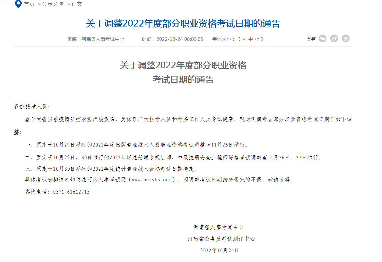 今日,河南人事考試網一早發布了《關于調整2022年度部分職業資格考試日期的通告》,通告稱于我省當前疫情防控形勢嚴峻復雜,為保證廣大報考人員和考務工作人員身體健康,現對河南考區部分職業資格考試日期作如下調整: