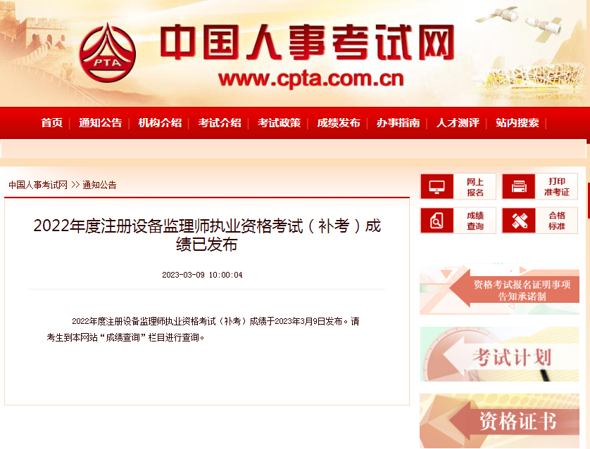 2022年度注冊設備監理師執業資格考試(補考)成績于2023年3月9日發布。請考生到中國人事考試網(http://www.cpta.com.cn/index.html)“成績查詢”欄目進行查詢。