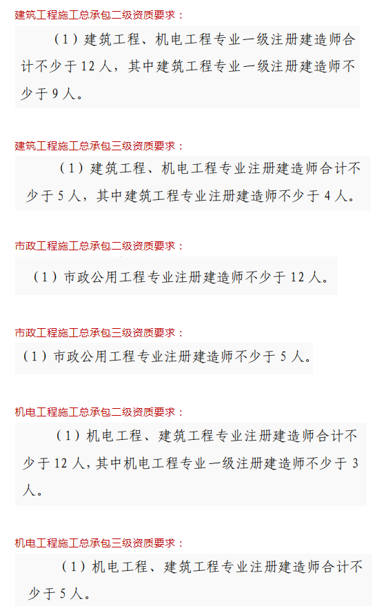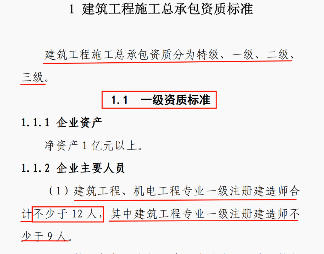 其中明確:申請(qǐng)建筑施工總承包一級(jí)資質(zhì),要求企業(yè)主要人員中,一建建筑與機(jī)電合計(jì)12人及以上,其中建筑9人及以上。