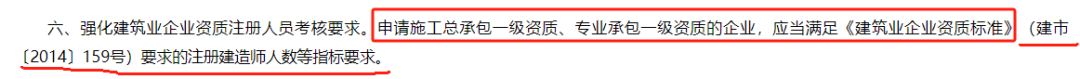 明確:申請(qǐng)施工總承包和專業(yè)承包一級(jí)資質(zhì)的企業(yè),應(yīng)當(dāng)滿足《建筑業(yè)企業(yè)資質(zhì)標(biāo)準(zhǔn)》 (建市[2014]159號(hào))要求的注冊(cè)建造師人數(shù)等指標(biāo)要求。