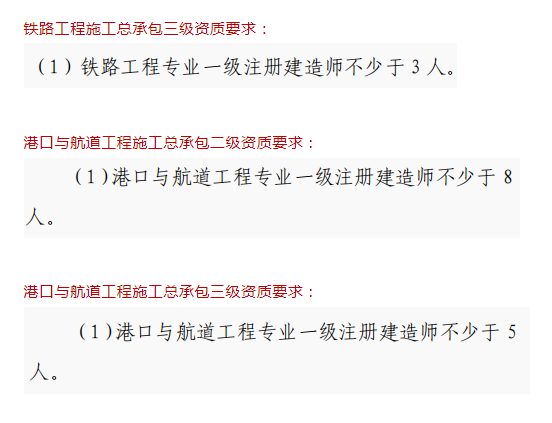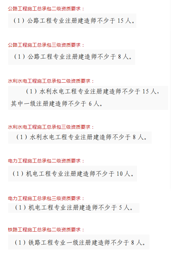 申請(qǐng)施工總承包二級(jí)、專業(yè)承包一級(jí)(不含公路、水運(yùn)、水利、鐵路、民航方面的專業(yè)承包一級(jí)及涉及多個(gè)專業(yè)的專業(yè)承包一級(jí))、專業(yè)承包二級(jí)(不含鐵路、民航方面的專業(yè)承包二級(jí))資質(zhì)的企業(yè),應(yīng)當(dāng)滿足《建筑業(yè)企業(yè)資質(zhì)標(biāo)準(zhǔn)》(建市〔2014〕159號(hào))要求的注冊(cè)建造師人數(shù)等指標(biāo)要求。