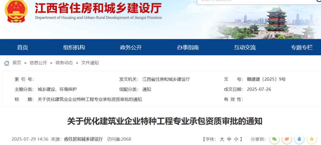 7月29日,江西省住建廳發布《關于優化建筑業企業特種工程專業承包資質審批的通知》,本通知本通知自8月1日起施行。