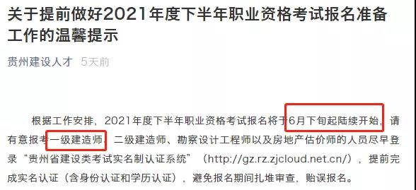 根據工作安排,2021年度下半年職業資格考試報名將于6月下旬起陸續開始,請有意報考一級建造師、二級建造師、勘察設計工程師以及房地產估價師的人員盡早登錄“貴州省建設類考試實名制認證系統”,提前完成實名認證(含身份認證和學歷認證),避免報名期間扎堆審查,貽誤報名。