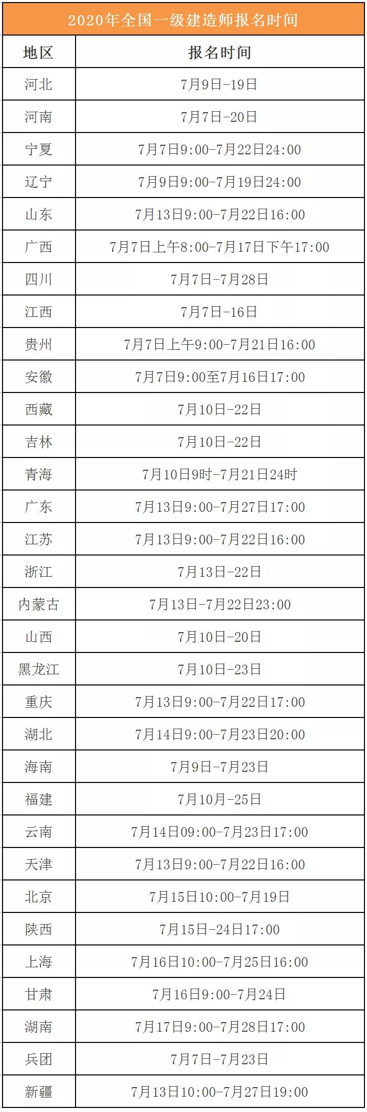 下面是2020年一建各省份報名時間匯總表,給大家作為一個參考。