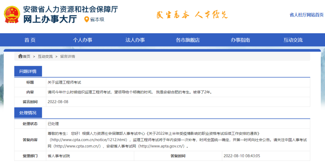 尊敬的考生:您好!根據人力資源社會保障部人事考試中心《關于2022年上半年受疫情影響的職業資格考試后續工作安排的通告》(http://www.cpta.com.cn/notice/1212.html),監理工程師考試將于年內安排一次補考,時間全國統一確定,并第一時間向社會公告。請關注中國人事考試網(http://www.cpta.com.cn/)、安徽省人事考試網(http://www.apta.gov.cn/)。