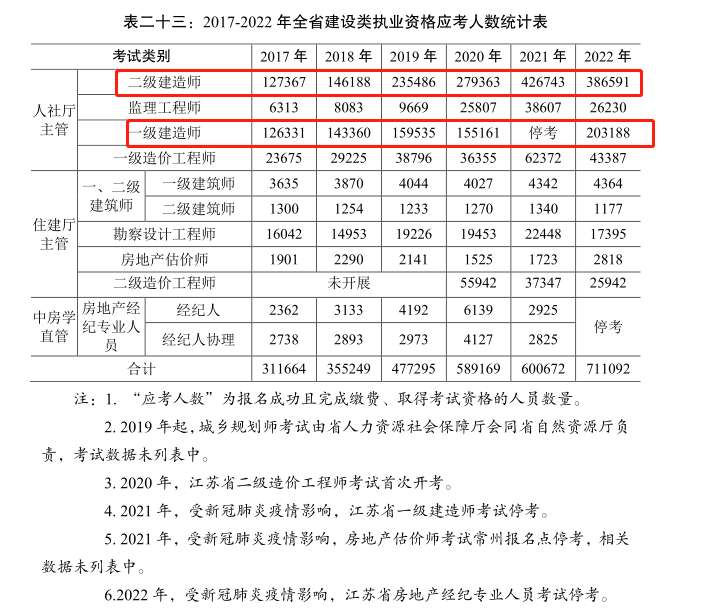 2022年,9項(xiàng)國家級(jí)建設(shè)類執(zhí)業(yè)資格考試,報(bào)考總?cè)藬?shù)達(dá)71.1萬余人。其中二建386591人,一建203199人,一造43387人,監(jiān)理26230人。