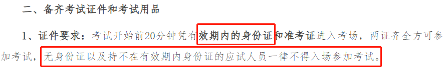 憑有效期內的身份證和準考證進入考場,兩證齊全方可參加考試,無身份證以及持不在有效期內身份證的應試人員一律不得入場參加考試。