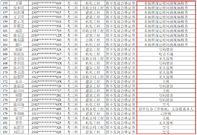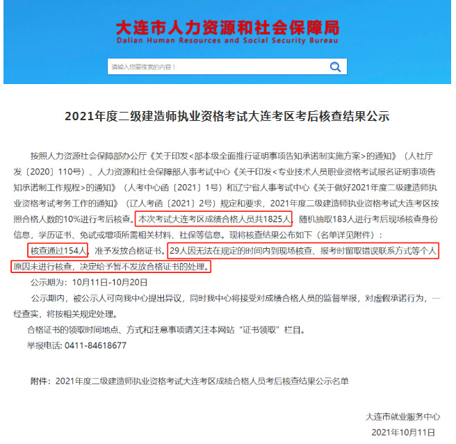 大連市人社局發布《2021年度二級建造師執業資格考試大連考區考后核查結果公示》,共1825人成績合格,隨機抽查的183人中通過154人,29人因無法在規定的時間內到現場核查、報考時留取錯誤聯系方式等個人原因未進行核查,決定給予暫不發放合格證書的處理。