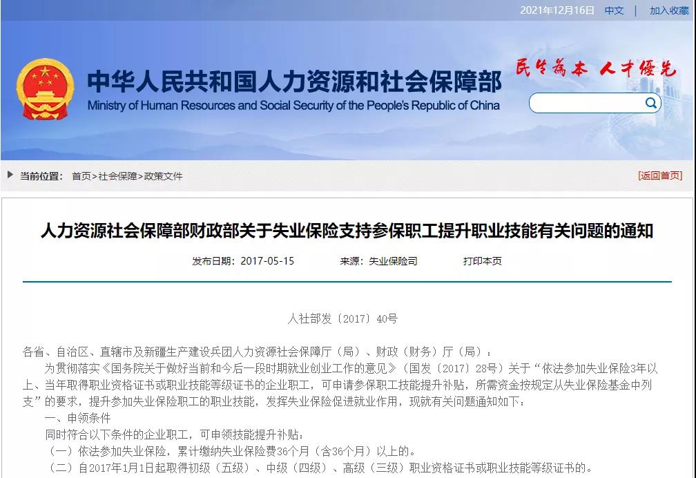 早在2017年,人社部發布了《關于失業保險支持參保職工提升職業技能有關問題的通知》。