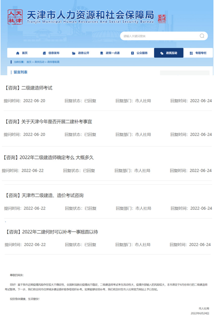 最近,有很多考生在天津人社局咨詢今年是否可以重新組織二建考試,官方給出了統(tǒng)一的答復(fù)。(注:信息來源于天津市人力資源和社會保障局。)