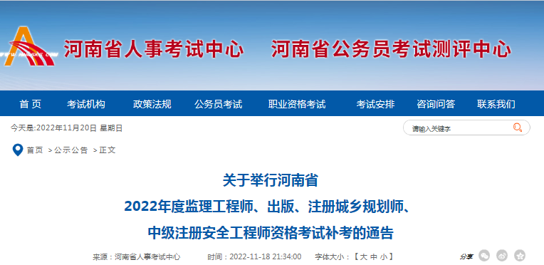 根據(jù)人力資源社會保障部人事考試中心《關(guān)于做好2022年度出版專業(yè)技術(shù)人員職業(yè)資格考試等4項考試暫??荚嚨貐^(qū)補考考務(wù)工作的函》(人考中心函〔2022〕72號)工作安排,河南省將對2022年度監(jiān)理工程師、出版、注冊城鄉(xiāng)規(guī)劃師、中級注冊安全工程師4項資格考試已報名繳費的報考人員于11月26、27日安排補考。本次補考實行屬地考試,考區(qū)以報考人員網(wǎng)上報名時自行填報為準(zhǔn)。