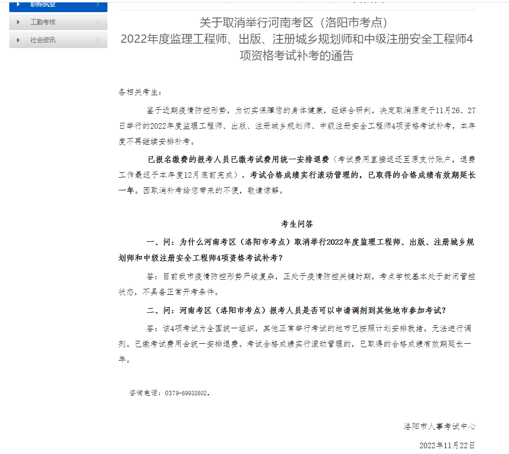 11月22日9時洛陽人事考試網發布了《關于取消舉行河南考區(洛陽市考點) 2022年度監理工程師、出版、注冊城鄉規劃師和 中級注冊安全工程師4項資格考試補考的通告》,取消舉行河南考區(洛陽市考點) 2022年度監理工程師、出版、注冊城鄉規劃師和 中級注冊安全工程師4項資格考試補考,本年度不再安排補考且無法調劑到其他地區考試,12月底完成統一退費。