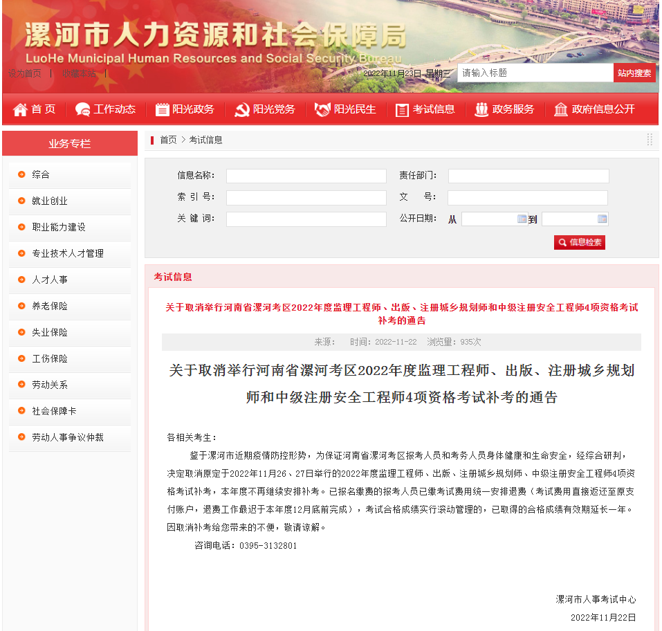11月22日漯河市人力資源和社會保障局發布了《關于取消舉行河南漯河考區 2022年度監理工程師、出版、注冊城鄉規劃師和 中級注冊安全工程師4項資格考試補考的通告》,取消舉行河南漯河考區 2022年度監理工程師、出版、注冊城鄉規劃師和 中級注冊安全工程師4項資格考試補考,本年度不再安排補考且無法調劑到其他地區考試,12月底完成統一退費。