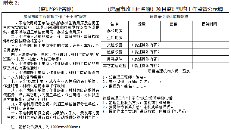 - 各項目監理機構應在房屋市政工程現場顯著位置,懸掛《項目監理機構工作監督公示牌》。