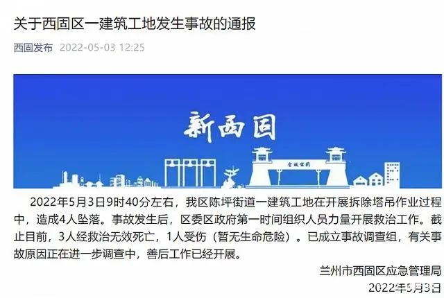 2022年5月3日,據甘肅蘭州西固發布公眾號消息,2022年5月3日9時40分左右,該區陳坪街道一建筑工地在開展拆除塔吊作業過程中,造成4人墜落。事故發生后,區委區政府第一時間組織人員力量開展救治工作。截至目前,3人經救治無效死亡,1人受傷(暫無生命危險)。已成立事故調查組,有關事故原因正在進一步調查中,善后工作已經開展。