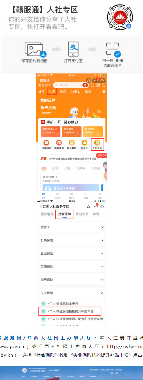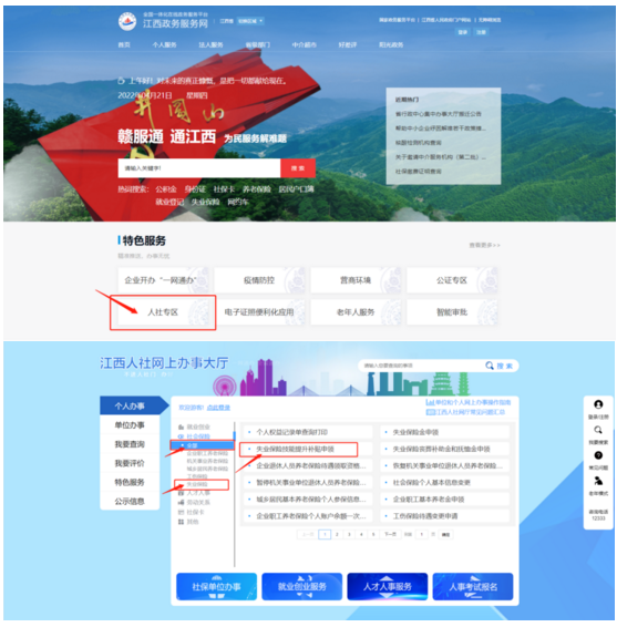 方式二/江西政務服務網/江西人社網上辦事大廳:本人注冊并登陸江西政務服務網(http://www.jxzwfww.gov.cn)或江西人社網上辦事大廳(http://zwfw--rst--jiangxi--gov--cn--e4670.ipv6.jiangxi.gov.cn),選擇“社會保險”找到“失業保險技能提升補貼申領”點擊填寫相應信息申領。