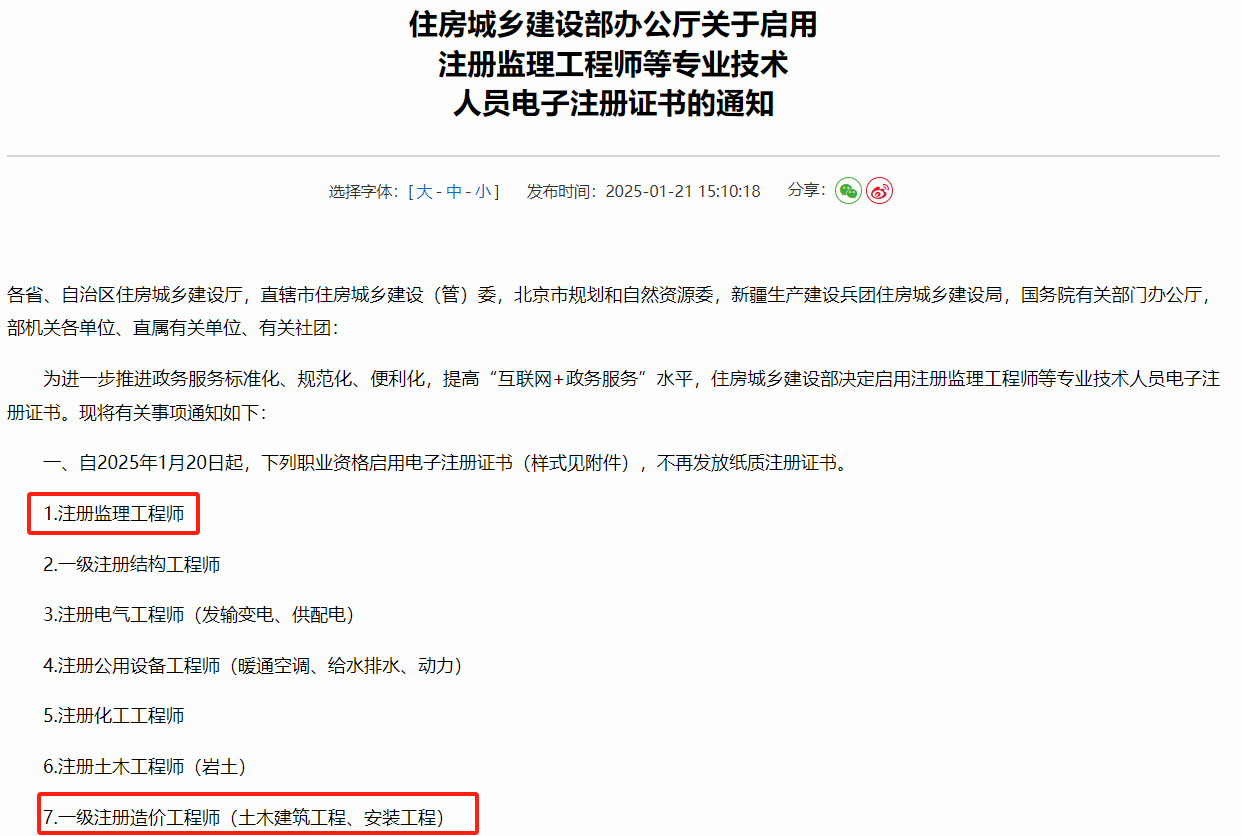 今年1月20號起,7項職業資格不再發放紙質版證書,全部啟用電子注冊證書,其中包括一造(土建、安裝)和監理。
