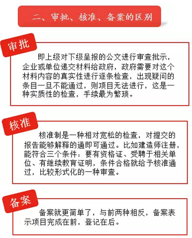 國務院近年來對一些需要政府審批的工程或項目在手續上進行了簡化,曾先后6次取消了一大批行政審批事項,據不完全統計大概有超過1000項。改革的目的是放開政府監管,市場能自行調節或企業能自主完善的,大力減少審批事項,轉而改為核準或者備案。例如:公司登記、基金發行,當然也包括建造師考試等。于是有人將“取消建造師考試審批”誤解為“取消建造師考試”,以訛傳訛,把謠言傳為“事實”。那么何為審批?跟核準與備案有哪些區別?