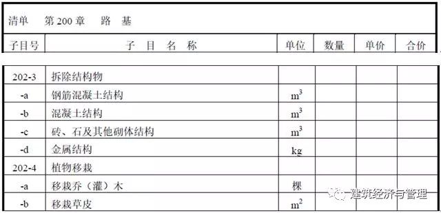 2018標準文件對過去工程量清單子目劃分不合理的進行了修改或刪減,對部分工程量清單子目的劃分更加細化,使工程量清單的子目設置更加符合現階段公路工程施工的實際需要。如200章202-3 拆除結構物增加了拆除金屬結構,增加了202-4 植物移栽。如下表