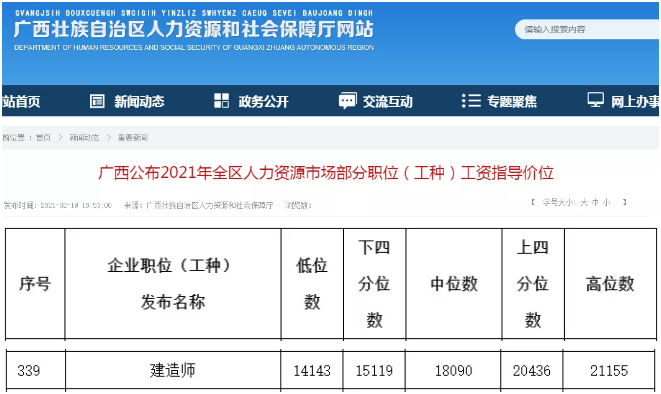 今年年初時,廣西人社廳公布《2021年全區人力資源市場部分職位(工種)工資指導價位》,建議建造師工資水平為:14143元~21155元。