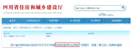 11月19日,四川省住房和城鄉建設廳發布《四川省住房和城鄉建設廳關于2021年度注冊建造師執業資格“雙隨機”檢查(第三批)結果的通告》,部分注冊建造師因未到崗或到崗率低,檢查不合格。