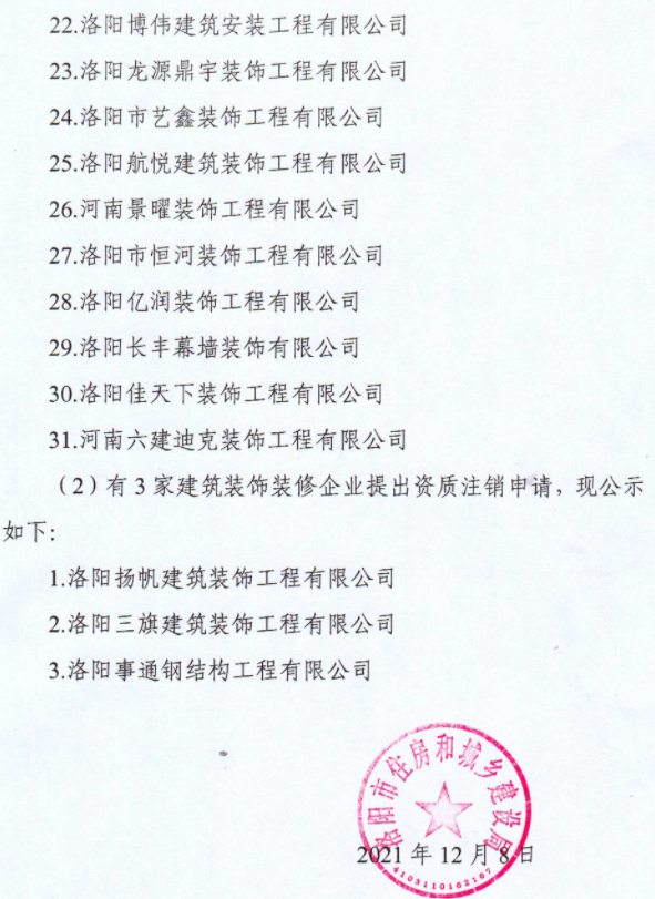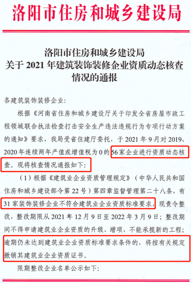 近日,洛陽市住建局發布了關于2021年建筑裝飾裝修企業資質動態核查情況的通報。