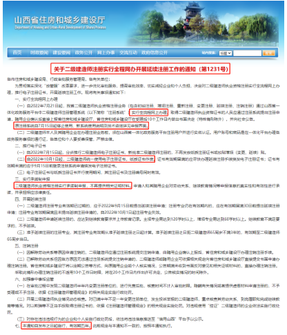 自2022年7月21日起,我省二級建造師執業資格注冊業務(包含初始注冊、增項注冊、重新注冊、變更注冊、延續注冊、注銷注冊)通過山西省一體化政務服務平臺中二級建造師注冊管理系統實行全流程網上辦理。