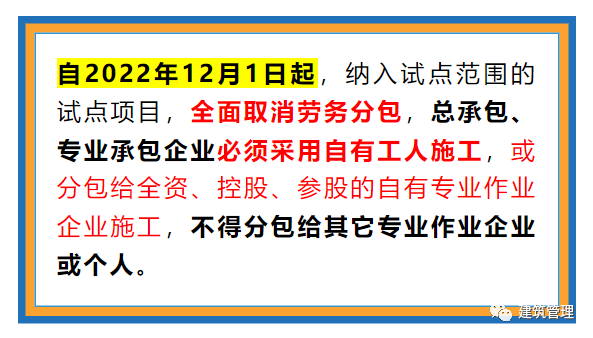 自2022年12月1日起,納入試點(diǎn)范圍的試點(diǎn)項(xiàng)目(主城都市區(qū)政府投資的房屋市政工程以及全市范圍內(nèi)的技術(shù)復(fù)雜項(xiàng)目),逐步實(shí)現(xiàn)全面自有工人或自有專業(yè)作業(yè)企業(yè)施工。