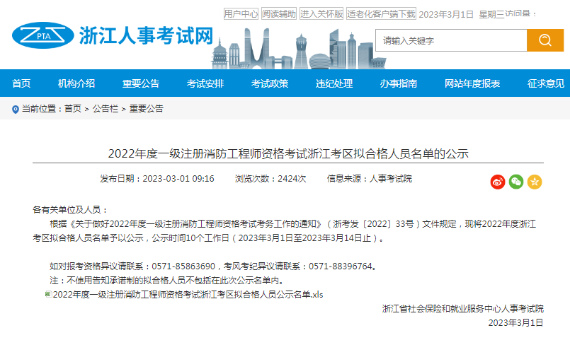 3月1日,浙江人事考試網(wǎng)發(fā)布了《關于做好2022年度一級注冊消防工程師資格考試考務工作的通知》(浙考發(fā)〔2022〕33號)文件規(guī)定,現(xiàn)將2022年度浙江考區(qū)擬合格人員名單予以公示,公示時間10個工作日(2023年3月1日至2023年3月14日止)。