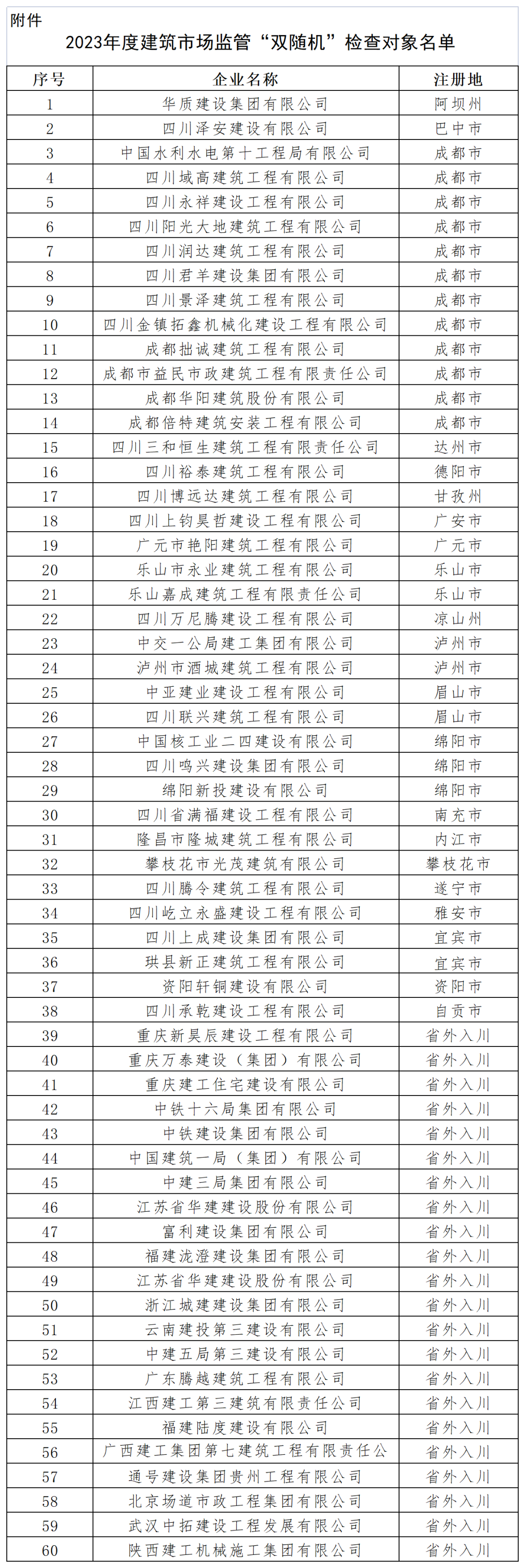 3月16日,四川省住建廳發布《關于公布2023年度建筑市場監管“雙隨機”檢查對象名單的通知》。